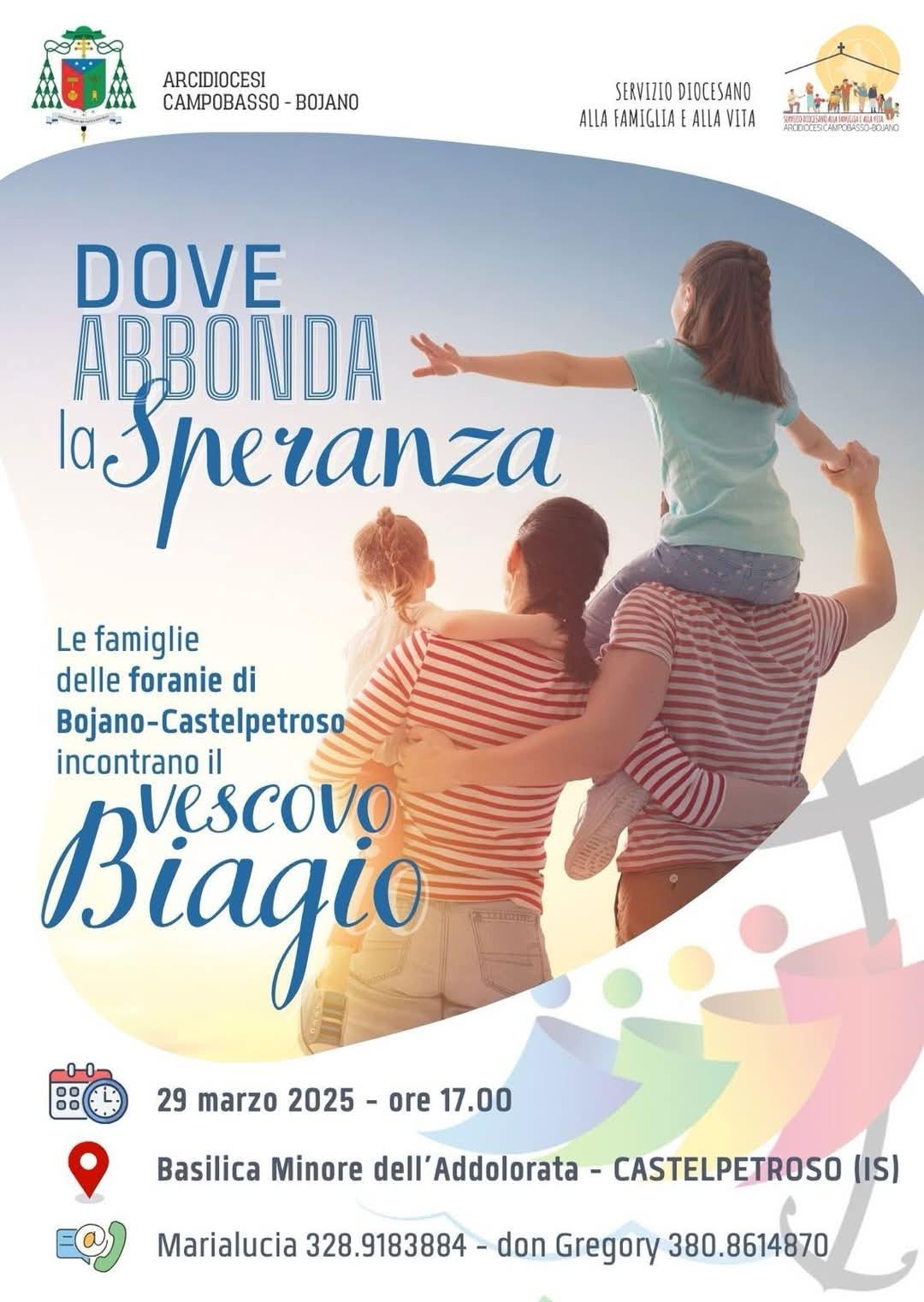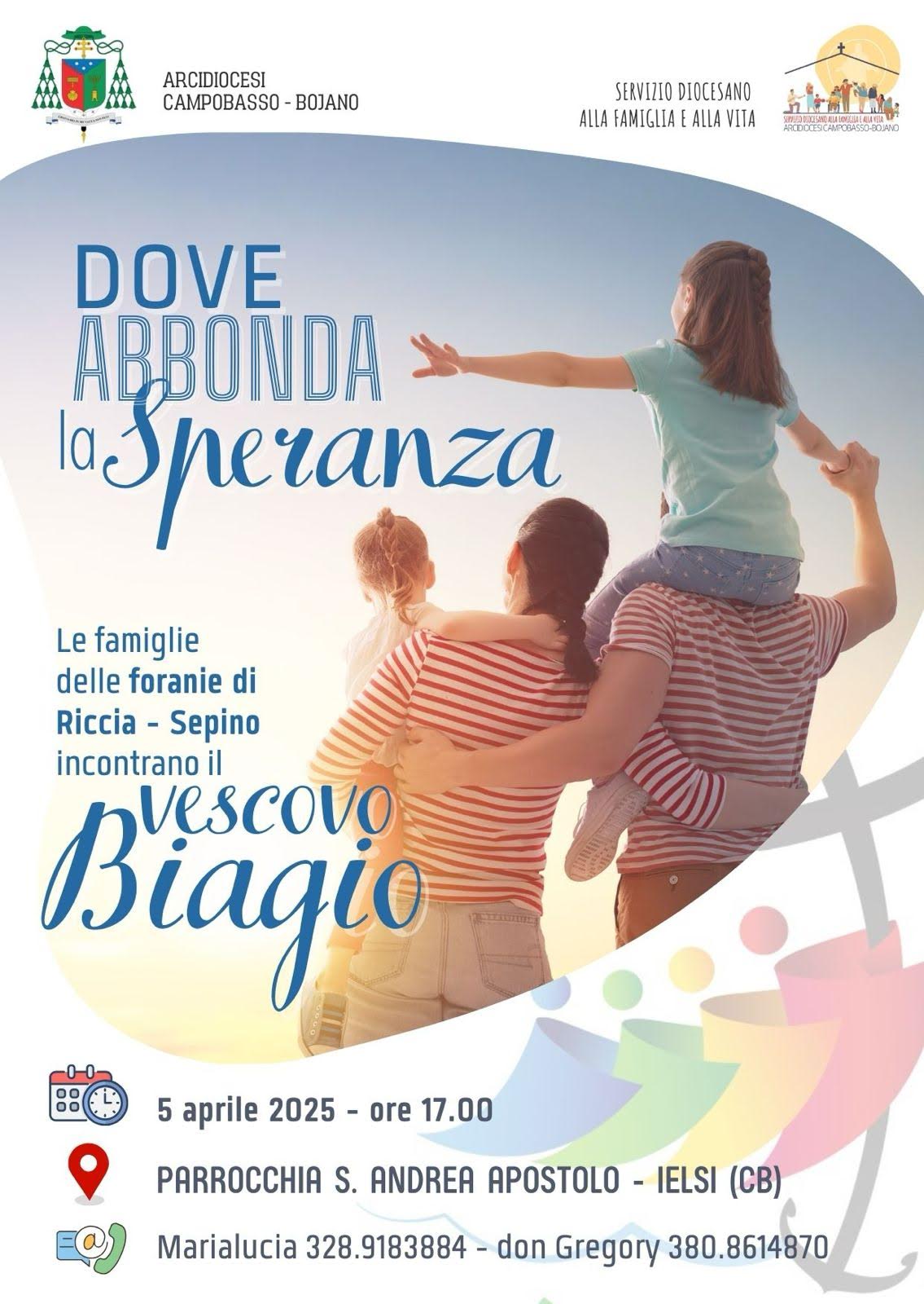 Il programma prevede tre incontri con il nostro Vescovo Biagio, pensati per famiglie, coppie, anziani e chiunque desideri approfondire il significato profondo di questo Giubileo. Questi incontri offriranno momenti di riflessione e condivisione, con l’obiettivo di riscoprire la speranza che nasce nelle famiglie e di crescere insieme nella fede. Ogni incontro è un’opportunità per rafforzare i legami e vivere il cammino spirituale insieme.