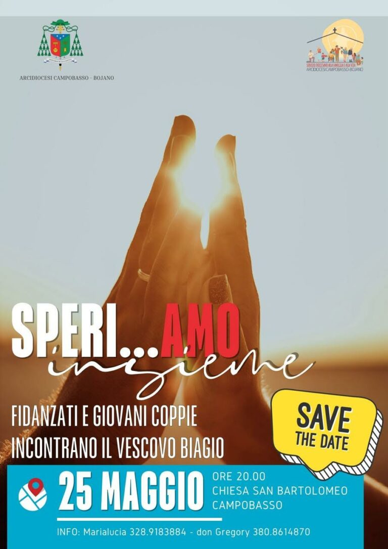 Il Giubileo offre anche un’opportunità speciale per le coppie di sposi e i fidanzati. Il 25 maggio 2025, ci sarà un incontro con il Vescovo Biagio nella Chiesa di San Bartolomeo a Campobasso, dedicato a coloro che hanno completato il percorso di preparazione al matrimonio- Questo incontro sarà un momento di preghiera, un’opportunità per affidare al Signore i sogni e le speranze di ciascuno e per ricevere parole di incoraggiamento e speranza per la vita matrimoniale.