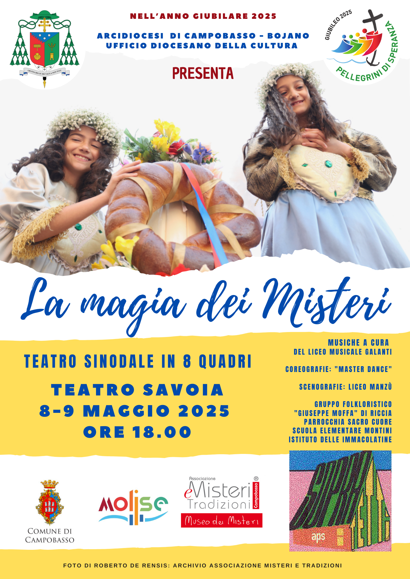 Per questo l’Ass. Sopraitetti aps, sotto l’egida dell’Arcidiocesi di Campobasso-Bojano, in collaborazione con altri Enti e Associazioni, Scuole e Parrocchie della città, ha allestito il Musical: “La Magia dei Misteri” SPETTACOLO IN 8 QUADRI al Teatro Savoia – 8-9 maggio 2025