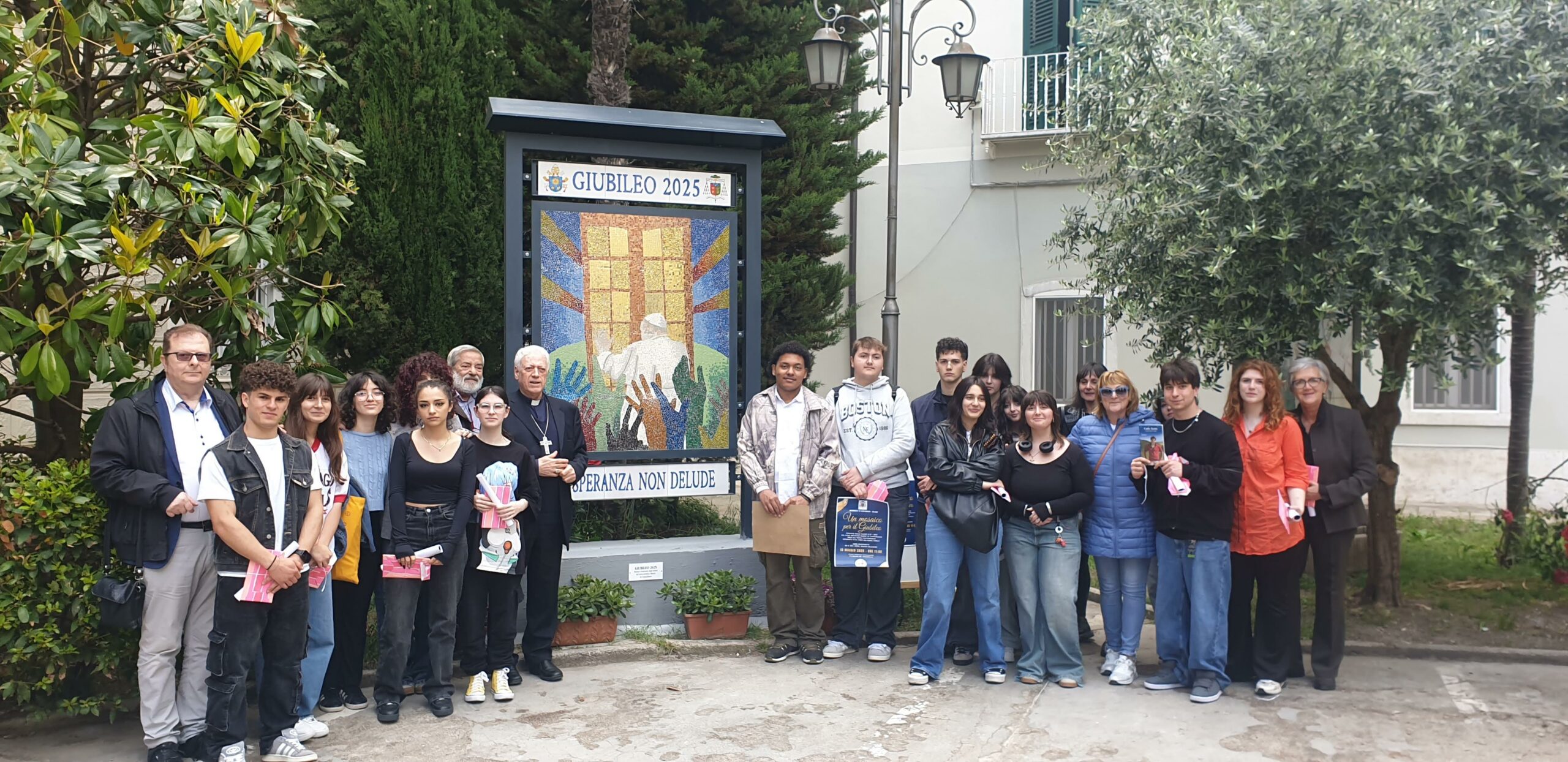 Se i passanti per via Mazzini voltano lo sguardo verso il giardino della Curia, troveranno una sorpresa piacevole: un mosaico per il Giubileo. È stato realizzato per la donazione di un sacerdote salesiano, Don Giovanni Carnevale, per il coinvolgimento dell’Associazione «Sopraitetti APS» e l’opera degli alunni della IIIª B del Liceo Artistico Manzù di Campobasso, coordinati dalla prof.ssa Teresa Mastrangelo.